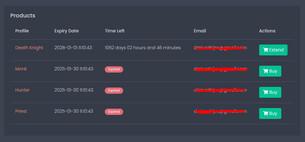 Otherwise if you use different email during purchase, your expiration profile time in dashboard will not update automatically.